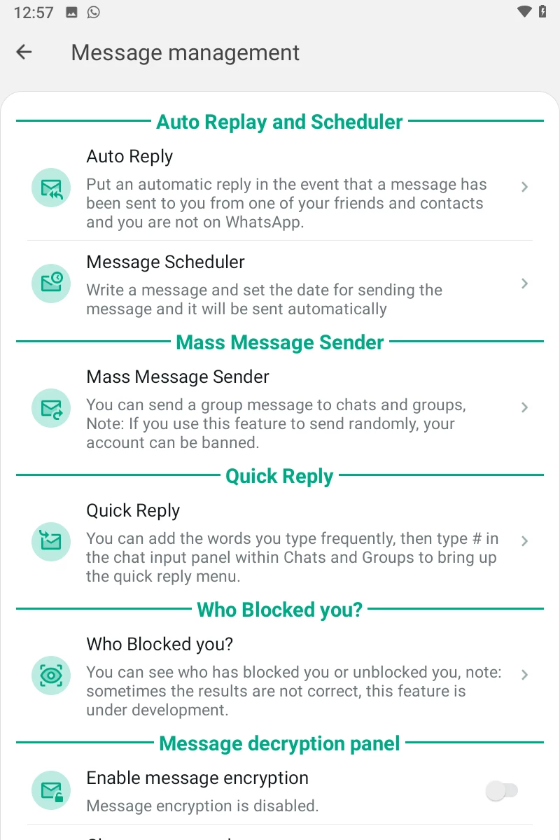 La fonction anti-bannissement, avec son niveau de sécurité renforcé, vous permet d'utiliser l'application en toute liberté. Contrairement aux autres versions modifiées de WhatsApp, vous ne risquez aucun bannissement de l'application officielle.